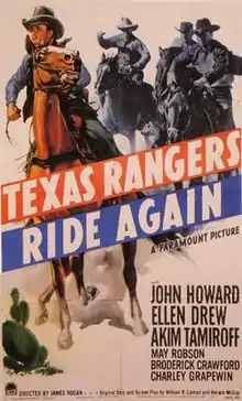 Texas Rangers Ride Again is a 1940 American Western film directed by James P. Hogan, written by William R. Lipman and Horace McCoy, and starring Ellen Drew, John Howard, Akim Tamiroff, May Robson, Broderick Crawford, Charley Grapewin, and John Miljan. It was released on December 13, 1940, by Paramount Pictures.[1][2] It was a sequel to The Texas Rangers.