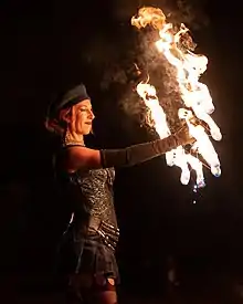 On the larger stages, other, grander events take place, the largest of which is the Joust. The Joust is performed by the Hanlon-Lees Action Theatre, and is an accurate reenactment of a medieval joust, featuring authentic weapons, costumed horses, and armored knights.[10] Other performances at the festival include acts designed for mature audiences only; as well as for youngsters. Staple performances include The Birds of Prey show, a highly praised free-flying bird show including hawks, owls, vultures, and eagles,[11] the Fire Whip Show, the Clan Tynker Family Circus, the Pride of Bedlam, and the School of Sword.[12]
