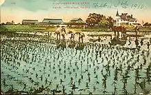 Texas rice industry on the Gulf Coast was originally established in 1904 when seed was imported from Japan. Japanese farmers were invited to the region by the Southern Pacific Railroad and the Houston Chamber of Commerce. There they acted as consultants, advising the local farmers on rice cultivation.[2] Seito Saibara, accompanied by his family and thirty Japanese colonists, oversaw the rice production which originated in Harris County at Webster. Their influence was such that the Saibara family was eventually credited with establishing the rice industry on the Texas Gulf Coast. In the first three years, the harvest averaged 34 barrels per acre of rice from Japanese seed, surpassing the average of 18 to 20 barrels per acre produced from the typical Texas seed.[2]