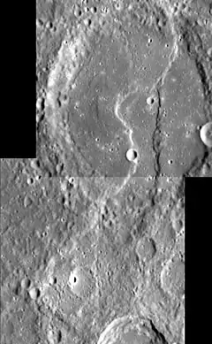 Scarps in the central and southern part of the crater enclose an area that is at a lower elevation than the rest of the crater. The scarps extend to the south out of the crater.