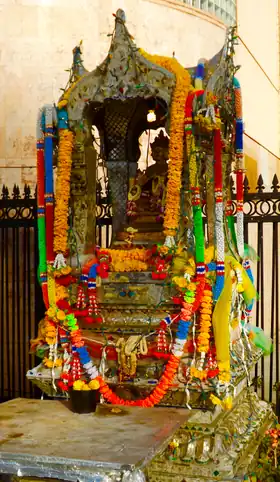 gourmands can stock up on bitter melon and round Thai eggplant. A Thai dessert shop offers preserved jackfruit, Pandan cookies and Kring Krang, crisply sweetened rice. The large Silom supermarket occupies the middle of a block near Hobart Boulevard, its exterior the rose-hued color of dusk with ornate trimming and a spirit house, draped with colorful garlands and a stone-faced Buddha image, guarding the entrance from destructive forces.[5]