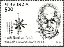 Pillai received the Sahitya Akademi Award in 1957 for the love epic, Chemmeen.[21] Kerala Sahitya Akademi selected Enippadikal for their annual award for novels in 1965.[22] His Novel, Kayar was selected for the Vayalar Award in 1984,[23] and he received the highest Indian literary award, Njanapeedam in 1984[24][25] and a year later, the Government of India awarded him the third highest civilian honour of the Padma Bhushan.[26] Sahitya Akademi elected him as a distinguished fellow in 1989;[27] he had already been a distinguished fellow of the Kerala Sahitya Akademi by then.[28] In 1994, the Government of Kerala awarded him Ezhuthachan Puraskaram, their highest literary honour.[29] In 1996 he was conferred with an honorary doctorate (D.Litt) by Mahatma Gandhi University.[30] India Post issued a commemorative postage stamp depicting his image in 2003, under the Jnanapith Award Winners series.[31] Sahitya Akademi commissioned a documentary film on the life of Pillai to be made[32] and M. T. Vasudevan Nair made Thakazhi, a documentary film of 57 minutes length, which was released a year before Pillai's death in 1998.[33] The Government of Kerala acquired Sankaramanagala, the ancestral home of Pillai, in 2000[34] and a museum, Thakazhi Memorial Museum was set up in 2001, honoring the writer's memory.[35]