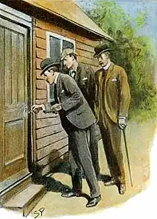 Holmes decides to accompany Hopkins to Forest Row, and upon arrival, Hopkins observes that someone has tried to break into Carey's cabin, but failed. After examining the inside of the cabin, Holmes deduces from the lack of dust that something has been taken from a shelf, even though the burglar did not get in. The stolen item was a book, or possibly a box. Holmes believes that the burglar will likely try again, this time bringing a more useful tool for the job. So, Holmes, Dr. Watson, and Hopkins all lie in wait for the burglar that night, and they are not disappointed. Along he comes, he breaks into the cabin, and goes through one of Carey's old logbooks, cursing when he finds that the information that he wants is missing, having been torn out of the book. As he is leaving the cabin, Hopkins moves in and arrests him.