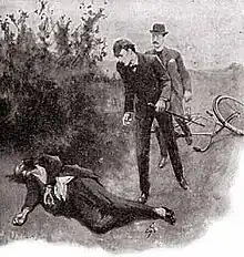![]() Holmes discovers Heidegger's body, 1904 illustration by Sidney Paget in The Strand Magazine | |