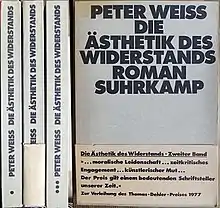 Reinhard Baumgart in the Süddeutsche Zeitung reproached Weiss for passing off "a life dreamed in red" (the title of the review) as a novel.[44] Other authors also took more aim at Weiss's oft-published political confession than at the novel form itself, for example Moritz Menzel and Hans Christoph Buch in Der Spiegel.[45][46] While the first volume was only reviewed very positively by Alfred Andersch in the Frankfurter Rundschau (he coined the term "roman d'essai" or essay novel, which was later frequently used),[47] the subsequent volumes received more positive reviews, for example by Wolfram Schütte in the Frankfurter Rundschau and by Joachim Kaiser and Heinrich Vormweg in the Süddeutsche Zeitung.[48][49] At least Andersch, Schütte and Vormweg also evaluated the work's remembrance-political intention more than its formal realisation, as Martin Rector shows in his overview.[50]