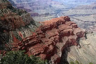 | Type of rock | Esplanade Sandstone horizontal platform (unit 4), (complete Supai Group on platform of Redwall Limestone) and Supai Group, Redwall Limestone, (Tonto Group- 3-units) _3-Muav Limestone, _2-Bright Angel Shale, _1-Tapeats Sandstone, Vishnu Basement Rocks |