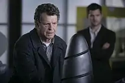 Executive producer Jeff Pinkner commented, "Our goal was to take a character who is by definition unknowable and make him someone you can connect to emotionally. He's more specifically connected with the overall character mythology of the show than we ever expected."[5] The decision to remove his eyebrows was made an hour before he first appeared, which caused stress in the make-up department because Cerveris would not shave his eyebrows; he commented about the affair, "I've got a little too much else going on, and who knows if they would ever grow back. I have little enough hair as it is."[6] "The Arrival" was the first episode in which the Observer had dialogue, and the first in which he was treated as a focal character.[7] In addition to Cerveris, actor Michael Kelly made a guest appearance in the episode.[8][9]