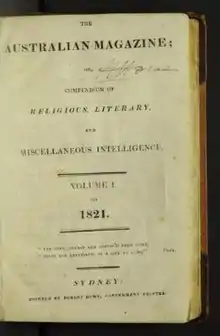 The Australian Magazine appeared monthly in Sydney, New South Wales, between May 1821 and May 1822.[1] It was Octavo in size, contained 32 pages and individual copies sold for two shillings and sixpence per issue.[2] Those who took out an annual subscription paid a reduced amount of one shilling and threepence per issue.[3] Readers from as far away as Hobart subscribed to the publication.