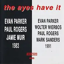 The Ayes Have It is an album by saxophonist Evan Parker. Tracks 1–4 were recorded in a London studio during December 1983, and feature Parker with bassist Paul Rogers, and, in a rare recorded appearance, percussionist Jamie Muir. The remaining track was recorded live at the Angel and Crown pub in London on August 1, 1991, and features Parker, Rogers, trombonist Wolter Wierbos, and percussionist Mark Sanders. The album was released by Emanem Records in 2001.[1][2][3][4]