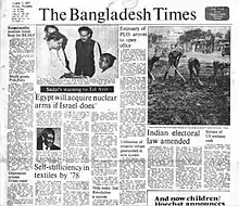 The Bangladesh Times was founded in 1974 by Sheikh Fazlul Haque Mani.[6] In 1975, The Bangladesh Times along with Ittefaq, Dainik Bangla, and Bangladesh Observer were nationalized by the Government of Bangladesh. The government banned all newspapers except the four nationalized ones.[7] Following the assassination of Sheikh Mujibur Rahman in the 15 August 1975 Bangladesh coup d'état the newspaper welcomed the government of Khandaker Moshtaque Ahmed.[8] Enayetullah Khan, the editor of the Holiday, became editor of the newspaper in 1975. Khan would write against Sheikh Mujibur Rahman in the newspaper and would go on to serve as a Minister in the Ziaur Rahman administration.[9] In May 1976, The Bangladesh Times provided the biggest media coverage in Bangladesh to the Farakka Long March.[10] Khan served as the editor of the newspaper till 1977.[11] The Bangladesh Times were closed in 1997 along with Danik Bangla and other state owned newspapers.[12] In March 2004, Information Minister Tariqul Islam said the government is considering reopening the newspaper along with Dainik Bangla under private management.[13]