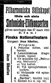 A 27 March 1913 advertisement from Hufvudstadsbladet promoting the premiere of Sibelius's The Bard
