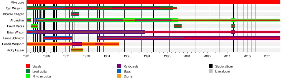 ![]() The Beach Boys during their 2012 reunion. From left: Brian Wilson, David Marks, Mike Love, Bruce Johnston, Al Jardine. | |