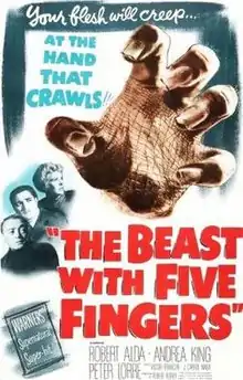 The Beast with Five Fingers is a 1946 American mystery horror film directed by Robert Florey from a screenplay by Curt Siodmak, based on a short story of the same name written by W. F. Harvey and first published in 1919 in The New Decameron. The film stars Robert Alda, Victor Francen, Andrea King, and Peter Lorre. The film's score was composed by Max Steiner.