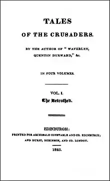 The first edition was published as part of Tales of the Crusaders in Edinburgh by Archibald Constable and Co. on 22 June 1825. It was advertised for publication by Hurst, Robinson, and Co. in London on the same date, but apparently not issued until 11 July. The price was two guineas (£2 2s or £2.10).[3] As with all of the Waverley novels until 1827 publication was anonymous. There is no conclusive evidence that Scott returned to The Betrothed until the spring of 1831 when he revised the text and provided an introduction and notes for the 'Magnum' edition, in which it appeared as Volume 37 in June 1832.[4]