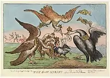Many illustrations of La Fontaine's fables follow similar themes, showing three or four peacocks reaching to reclaim their stolen feathers from the jackdaw,[18] including Kano Tomo-nobou's Japanese woodcut version published from Tokyo in 1894.[19] Political cartoons celebrating the defeat of Napoleon imply this imagery, with feathered kings and emperors snatching away his finery.[20] There was a slightly earlier Japanese woodprint by Kawanabe Kyosai in his Isoho Monogotari series (1870–80) which shows peacocks attacking a prostrate crow.[21] In general the artist was dependent on John Tenniel's illustrations of the fables for his interpretations, but in this case the print is similar to the picture in the Croxall edition of 1814.[22]