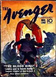 "The Blood Ring" is the 7th pulp magazine story to feature The Avenger. Written by Paul Ernst, it was published in the March 1, 1940 issue of The Avenger magazine. This novel was re-published under its original title by Paperback Library on November 1, 1972.