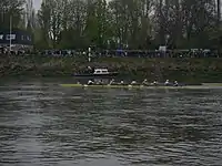 OUBC were scheduled to race against OBUBC on 10 March 2019, but the fixture was postponed as a result of poor weather conditions.[35] The fixture was reorganised and took place on 17 March 2019, in two pieces.[36] The first race was from Chiswick Steps to Beverley Brook, and despite OUBC winning the toss and taking the more favourable Surrey side of the river, it was Oxford Brookes who took the early lead. By Hammersmith Bridge, OBUBC had a clear water advantage over the Dark Blues, finishing the race well ahead. The second piece, along the same section of the Championship Course, saw the crews switch starting stations, but a similar outcome. OUBC made a good start but OBUBC quickly overtook them and pulled away to win comfortably.[36] On 23 March 2019, OUBC raced against Leander Club from the Championship Course start line to Chiswick Steps. From the start, it was a close fixture with neither boat showing real dominance and the umpire Rob Clegg having to issue multiple warnings as both crews infringed each other's racing line. Oxford held a slight lead by the Mile Post but Leander responded to draw level as the crews passed Harrods, and took the lead at Chiswick Eyot. Warned once again by the umpire, Leander course correction allowed the Dark Blues into faster water, and into a canvas lead which they held to the conclusion of the race.[37]