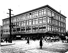 The Nordhoffs leased a small storefront in modern-day Belltown at 1st Avenue and Cedar Street that cost $25 per month. They invested their entire savings account into merchandise for the store and worked to attract customers away from the city's main retail district. Josephine Nordhoff stocked shelves, kept the books, and cleaned the store;[5] she later learned the Chinook language to wait on Native American customers.[6] To keep customers during the economic panic of the early 1890s, the Nordhoffs stocked sacks of pennies to provide small discounts.[4] The growing success of the store allowed the Nordhoffs to relocate closer to the business district in 1896, leasing an L-shaped building at 2nd Avenue and Pike Street.[5]