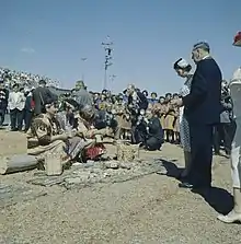 In 1970, Elizabeth II's presence at The Pas, Manitoba, provided an opportunity for the Opaskwayak Cree Nation to publicly express their perceptions of injustice meted out by the government.[75] Then, during a royal tour by the Queen in 1973, Harold Cardinal delivered a politically charged speech to the monarch and the Queen responded, stating that "her government recognized the importance of full compliance with the spirit and intent of treaties";[76] the whole exchange had been pre-arranged between the two.[40] The British High Commissioner to Canada at the time stated a Canadian official, likely Jean Chrétien, had said to him, "the monarchy and the fact that, on occasions, the Queen can talk directly to the native peoples, has helped to prevent in Canada anything like a direct confrontation similar to Wounded Knee".[60] Still, during the same tour, Indigenous people were not always granted the personal time with the Queen that they desired; the meetings with First Nations and Inuit tended to be purely ceremonial affairs wherein treaty issues were not officially discussed. For instance, when Queen Elizabeth arrived in Stoney Creek, Ontario, five chiefs in full feathered headdress and a cortege of 20 braves and their consorts came to present to her a letter outlining their grievances, but were prevented by officials from meeting with the sovereign.[77] In 1976, the Queen did receive First Nations delegations at Buckingham Palace, such as the group of Alberta Aboriginal Chiefs who, along with Lieutenant Governor of Alberta and Cree chief Ralph Steinhauer,[40] held audience with the monarch there.[75]