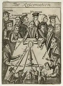 In this engraving-painting pair showing 15 reformers, the men standing around the table are identified as Heinrich Bullinger, Hieronymus Zanchi, John Knox, Ulrich Zwingli, Peter Martyr Vermigli, Martin Bucer, Jerome of Prague, and William Perkins. Seated are Jan Hus, Philip Melanchthon, Martin Luther, John Calvin, Theodore Beza, and John Wycliffe.