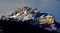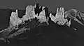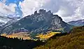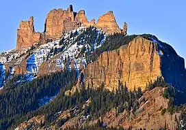 The Castles, elevation 12,296-feet (3,748 m), are situated in the West Elk Mountains which are a subrange of the Rocky Mountains. The landform is located 18 miles (29 km) northwest of Gunnison in the West Elk Wilderness on land managed by Gunnison National Forest. These 500-ft high pillars are the signature landmark of the West Elk Wilderness,[4] and are one of Colorado's most unique rock formations.[5] Precipitation runoff from the mountain's slopes drains into Castle Creek → Ohio Creek → Gunnison River. Topographic relief is significant as the summit rises 2,500 feet (762 m) above South Castle Creek in one mile (1.6 km). The landform's toponym has been officially adopted by the United States Board on Geographic Names.[2]