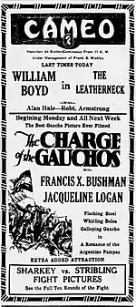 The Charge of the Gauchos (Argentine title: Una nueva y gloriosa nación) is a 1928 American-Argentine silent historical film directed by Albert H. Kelley and starring Francis X. Bushman, Jacqueline Logan, and Guido Trento. Bushman plays Manuel Belgrano, one of the leaders of the 1810 May Revolution. The film's Spanish title refers to a line from the Argentine national anthem. It was made as a patriotic endeavor designed to boost the small Argentine film industry, but with enough action and romance to appeal to international audiences particularly in the UK and the United States. The film was also released under the title The Beautiful Spy.[1]