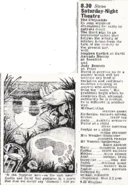 The Chrysalids is an adaptation of the John Wyndham 1955 novel of the same name, produced as a radio play by the BBC in March 1981. It was first broadcast on BBC Radio 4 on the 25 April 1981 with an audience of 150,000 listeners. The play was edited into three half hour episodes and broadcast in Canada by CBC Radio from 10 June to 24 June 1983. (There was a new adaptation of the book by Jane Rogers in 2012, broadcast in two one-hour episodes on BBC Radio 4.[1])