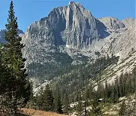 The Citadel is an 11,738-foot-elevation (3,578-meter) mountain summit located in the Sierra Nevada mountain range, in Fresno County of central California, United States.[3] It is situated in northern Kings Canyon National Park, 20 miles (32 km) west-southwest of the community of Big Pine, and 2.4 miles (3.9 km) south of Langille Peak. Topographic relief is significant as it rises 3,400 feet (1,000 meters) above Le Conte Canyon in approximately one mile. The long approach to this remote peak is made via the John Muir Trail. The Northeast Arête, also known as Edge of Time Arête, is considered one of the classic climbing routes in the Sierra Nevada.[5]