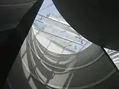 The chapel itself occupies nearly all of the ground floor of the building and is accessed through a tall metal door from the greenhouse. The interior is a two-story stone cylinder with several semi-circular concrete constructions scalloping the walls. At the top of the cylinder are thin windows with several long prisms designed by the artist Charles Ross that create raking light and occasionally rainbows across the austere concrete interior.
