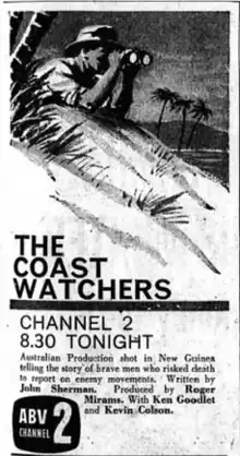 The Coastwatchers is a docudrama television film about coastwatchers made in 1959 by producer Roger Mirams for Pacific Films. It starred Ken Goodlet and Kevin Colson and was written by John Sherman and directed by Mirams.[5]