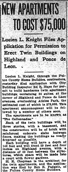 - ↑ "New apartments to cost $75,000: Lucien L. Knight files application for permission to erect twin buildings on Highland and Ponce de Leon", '"Atlanta Constitution, February 12, 1916