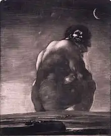 A series of parallel themes also exist in Disasters of War and the eponymous unnumbered print The Giant or Colossus, dating from between 1814 and 1818,[4] which shows a giant seated in a dark and desolate landscape with a crescent moon in the top corner. However, the giant's posture and the darkness of the night express a solitude that is different from the aggression shown in the painting and the print is not obviously related to war. It is not possible to ascertain if the giant's eyes are shut in the print, but it appears to be listening out for something. That is, the giant is doing something that perhaps Goya, who had been deaf since 1793, longed to be able to do. Or perhaps the giant's posture reflects the alert attentiveness of someone who is deaf or blind or both.
