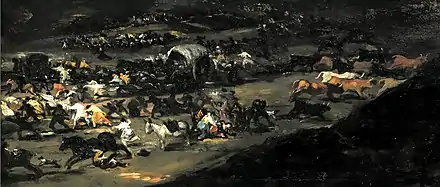 The technique used in this painting is similar to that used in Goya's Black Paintings, which were originally painted on the walls of Goya's house, Quinta del Sordo. A later date for the painting of the picture has even been suggested, which would mean that The Colossus mentioned in the inventory of 1812 is a different painting. However, Nigel Glendinning has refuted this later dating with arguments solely based on stylistic features of the painting. Glendinning argues that all the stylistic features found in The Colossus are already present (although not to the same degree) in Goya's previous paintings from The Meadow of San Isidro in 1788, which contains small figures painted with quick strokes; to Los Caprichos (1799) numbers 3 (Here comes the bogeyman) and 52 (What a tailor can do) for the theme of an oversized figure that is frightening.[9] As well as some drawings found in Goya's sketchbooks such as A giant figure on a balcony, A hooded giant and Proclamation Dream of the Witches (Gassier and Wilson No.s. 625, 633 and 638).[10]