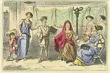 Gilbert à Beckett and John Leech first worked together while serving on the staff of the humorous magazine Punch, first published in 1841 under the editorship of Mark Lemon. Punch became famous for turning its satirical eye on London society, from the highest to the lowest in that early Victorian era. At that time the magazine's staff would meet weekly for dinner, debate and gossip around the famous Punch table,[2] and it was after one such dinner in 1864 that Henry Silver, himself a contributor to Punch, mentioned Leech in his unpublished diary, commenting that the Tory-supporting Leech "sneers at the Working Man, as usual." His political and social views often brought Leech into conflict with other more liberal members of Punch staff concerning the content on its pages, with Leech's cartoons frequently showing the poor of London as being stupid, while the rich were shown as frivolous. However, à Beckett had some sympathy for the poor, which was reflected in his actions while serving as a Commissioner for the Poor Law when in 1849 he presented a valuable report to the Home Secretary regarding the Andover workhouse scandal.[1][3]