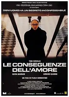 The Consequences of Love (Italian: Le Conseguenze dell'Amore) is a 2004 Italian psychological thriller film written and directed by Paolo Sorrentino. It stars Toni Servillo, Olivia Magnani, Adriano Giannini, Gianna Paola Scaffidi, and Raffaele Pisu. In the film, Titta Di Girolamo (Servillo), a mysterious and brooding Italian ex-businessman, begins a relationship with Sofia (Magnani), the barmaid at the Swiss hotel where he lives.
