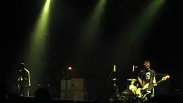 After recording a demo and garnering label interest, the band started playing live around this time, at venues like the Brudenell Social Club in Leeds, and "squats and warehouse parties" with artists such as Calvin Johnston, Subway Sect, Herman Dune, and Ballboy. They also released a split 7-inch single on Leeds based garage/riot grrrl/punk label Squirrel Records during this period with former Shove/Boyskout member Jen Schande.[4] Limited to 300 copies on blue vinyl the record is now a rarity that sells for upwards of $150 on eBay.[5] According to Mojo magazine, 'On the strength of one demo, the rush to find the UK Strokes saw the three-piece fielding calls from major labels, pluggers and label managers' in 2002.[6] After several high-profile support slots, the band signed to the fledgling independent label Wichita Recordings in 2003 "we thought (they) were great because they sounded a bit like Pavement and had a big hook. We went to see them at the Metro on Oxford Street and completely fell in love with them. They seemed like such an obvious pop band. Every song sounded like a single" – Mark Bowen, Wichita Recordings.[7]