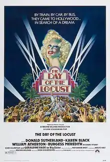 The Day of the Locust is a 1975 American satirical historical drama film directed by John Schlesinger and starring Donald Sutherland, Karen Black, William Atherton, Burgess Meredith, Richard Dysart, John Hillerman and Geraldine Page. Set in Hollywood, California, just before World War II, the film depicts the alienation and desperation of a disparate group of individuals whose dreams of success fail to come true. The screenplay by Waldo Salt is based on the 1939 novel of the same title by Nathanael West.