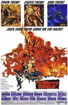 The Dirty Dozen is a 1967 American war film directed by Robert Aldrich and starring Lee Marvin with an ensemble supporting cast including Ernest Borgnine, Charles Bronson, Jim Brown, John Cassavetes, Richard Jaeckel, George Kennedy, Ralph Meeker, Robert Ryan, Trini Lopez, Telly Savalas, Donald Sutherland, Clint Walker and Robert Webber. Set in 1944 during World War II, the film follows the titular penal military unit of twelve convicts as they are trained as commandos by the Allies for a suicide mission ahead of the Normandy landings.