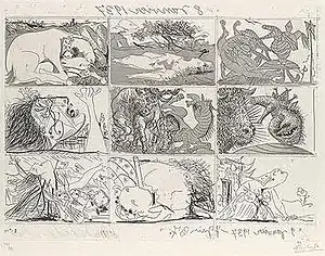 The Dream and Lie of Franco (Spanish: Sueño y mentira de Franco) is a series of two sheets of prints, comprising 18 individual images, and an accompanying prose poem, by Pablo Picasso produced in 1937. The sheets each contain nine images arranged in a 3x3 grid. The first 14, in etching and aquatint, are dated 8 January 1937. The remaining four images were added to the second printing plate later, without use of aquatint, and dated June 7, 1937.[1][2][3]