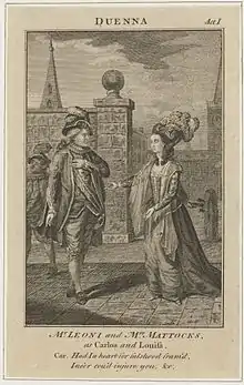 Sheridan wrote many of the roles in The Duenna to match a specific performer's ability, tailoring the text to the capacities of the singer. For example, Michael Leoni was cast for the role of Don Carlos, but his heavy German-Jewish accent meant that he could not deliver long lines of dialogue. To counter this problem Don Carlos's speeches were cut and his dialogues turned into duets and trios.[7] John Quick, who had proved himself as a great actor of Sheridan's comic characters as Bob Acres in The Rivals and Doctor Rosy in St Patrick's Day, was given the part of the equally ridiculous Isaac Mendoza; Mrs. Green, the original Mrs Malaprop, was given the role of the duenna.