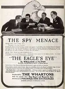 After Flynn's retirement from the Secret Service his work investigating sabotage during the war were interwoven with fictitious characters and events by Courtney Ryley Cooper into a 20-part spy thriller.[3] These were also published as weekly installments in The Atlanta Constitution's magazine section during 1918 under the title The Eagle's Eye: A True Story of the Imperial German Government's Spies and Intrigues in America.[5] Fifteen of the episodes were republished as chapters in a book the following year.[6]