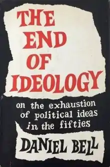 The End of Ideology: On the Exhaustion of Political Ideas in the Fifties is a collection of essays published in 1960 (New York, 2nd ed. 1962) by Daniel Bell, who described himself as a "socialist in economics, a liberal in politics, and a conservative in culture." He suggests that the older, grand-humanistic ideologies derived from the nineteenth and early twentieth centuries had been exhausted and that new, more parochial ideologies would soon arise. He argues that political ideology has become irrelevant among "sensible" people and that the polity of the future would be driven by piecemeal technological adjustments of the extant system.[1] With the rise of affluent welfare state and institutionalized bargaining between different groups, Bell maintains, revolutionary movements which aims to overthrow liberal democracy will no longer be able to attract the working classes.[2]