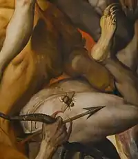 The Fall of the Rebel Angels is an oil on panel painting by Flemish painter Frans Floris. The painting was the central panel of a triptych. The side panels, however, were lost during the iconoclastic fury in the summer of 1566. The scene represented in the painting stems from Chapter 12 of the Book of Revelation.[1] It is one of Floris' most renowned works, often credited as his most famous painting.[2][3][1] Floris painted it for the fencer's guild of Antwerp, one of the city's militias, responsible for public security. The altarpiece hung in the Cathedral of Our Lady in Antwerp, above the guild's altar.[1] Like every other guild or corporation, the fencers had a patron saint, in this case, the Archangel Michael, who leads God's angels against the rebels in the painting.[2]