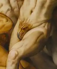 The painting shows Floris' knowledge of anatomy. Floris incorporated some subtle supplements among the writhing bodies, such as the Woman of the Apocalypse from the Book of Revelation. She is located in the small gap on the left, near the flaming torch clutched by one of the fallen angels. She stands on a crescent moon, dressed with the sun and crowned with twelve stars. The dragon wants to devour her child, but the angels are already taking it to heaven.[6] An eagle gives her two wings so she can escape to the desert. On the bottom right, there sits a bee.[2]