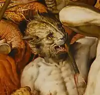 Frans Floris was a symbol of Antwerp Romanism, and the first artist in the Southern Netherlands to organize his studio after an Italian model.[5] Floris was one of the many Nordic artists from the 16th century who travelled to Italy. During his stay in Rome, Floris was influenced by the work of Italian Renaissance artists Michelangelo and Raphael. Floris composition and its writhing bodies recall Michelangelo's Last Judgement in the Sistine Chapel.[4] The woman and the dragon, on the other hand, show similarities with the visual language of the German artist Albrecht Dürer.[2]