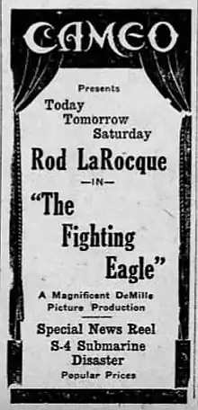 The Fighting Eagle is a 1927 American silent film adventure and romance drama starring Rod La Rocque. It was directed by Donald Crisp and it was produced by Cecil B. DeMille.[1][2] The film was set during the Napoleonic Era. The Fighting Eagle survives in several collections and has been released on DVD.[3]