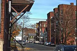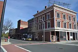 ![]() ![]() Top to bottom: Brick tenements in a style which characterized the area through much of its history; the Hotel Jess/Perkins Block and other buildings at Depot Square | |