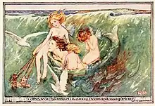 The basic premise recurs in Danish, Norwegian, German, and Slavonic folklore.[1] The Merman, a King of the Sea, marries an earthly maiden, and lives with her happily, for many years, but at last she leaves him for a visit to her friends, promising, however, to return.[2] Time passes, but she comes not back.[2] Scruples of conscience have arisen, and she chooses, as she thinks, between her soul and her family.[2] The story is told by the old Sea King, in what the reviewer Charles J. Peterson called "a wild, irregular melody", to his children.[2]