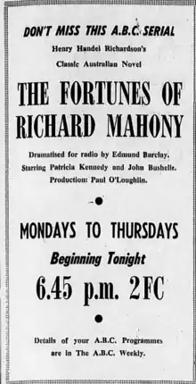 - ↑ Australian Broadcasting Commission. (1939), "Fortunes of Richard Mahony", ABC weekly, Sydney: ABC (Vol. 11 No. 29 (16 July 1949)), nla.obj-1370760524, retrieved 25 August 2023 – via Trove
