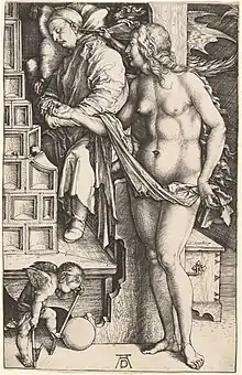 The Four Witches (German: Die Vier Hexen), or The Four Naked Women,[1] or The Four Sorceresses[2] or Scene in a Brothel, are titles given to a 1497 engraving by the German Renaissance artist Albrecht Dürer. One of his earliest signed engravings,[3] it shows four nude, exuberant women gathered conspiratorially in a circle in a confined interior setting, perhaps a bath house,[4] which appears to have entrances from either side. Although clearly erotic, a small horned demon, perhaps representing temptation,[5] is positioned in the left hand portal, peering out and holding what may be a hunting object, and is engulfed in flames.